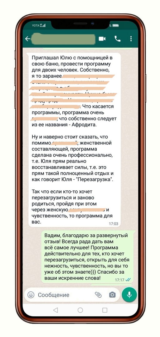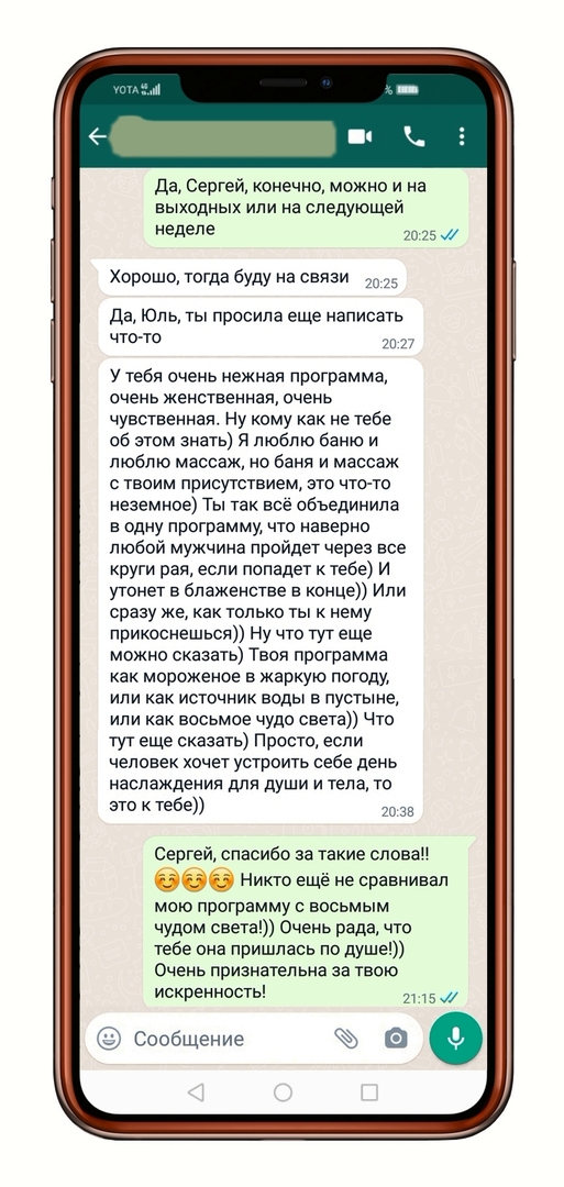 С помощью банной релаксации и чувственного массажа я погружаю вас в удивительный мир телесного наслаждения и познания собственной чувственности. Раскрываю для вас палитру удовольствий - эмоциональных, душевных, телесных, полностью перезагружая ваш ум и тело. В результате вы чувствуете себя обновленным и будто заново родившимся.